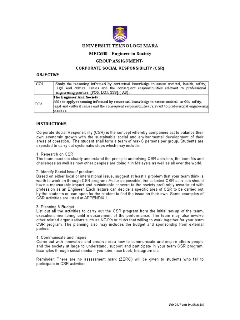 Group Assignment Csr Mec 600 Oct 2017 Corporate Social Responsibility Sustainability