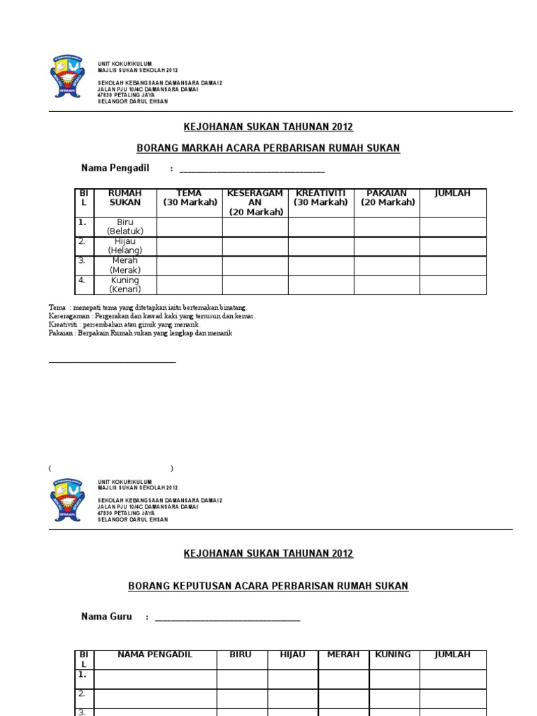 Borang Markah Rumah Sukan Docx
