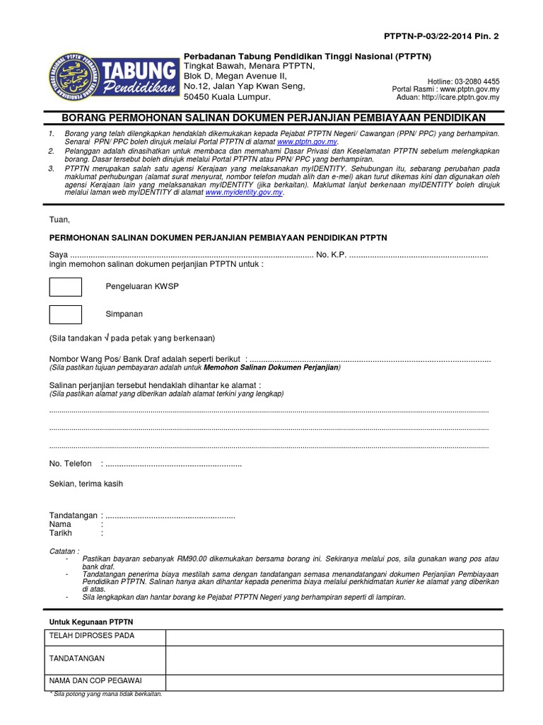 Borang Permohonan Salinan Dokumen Perjanjian Pembiayaan Pendidikan Pin 2