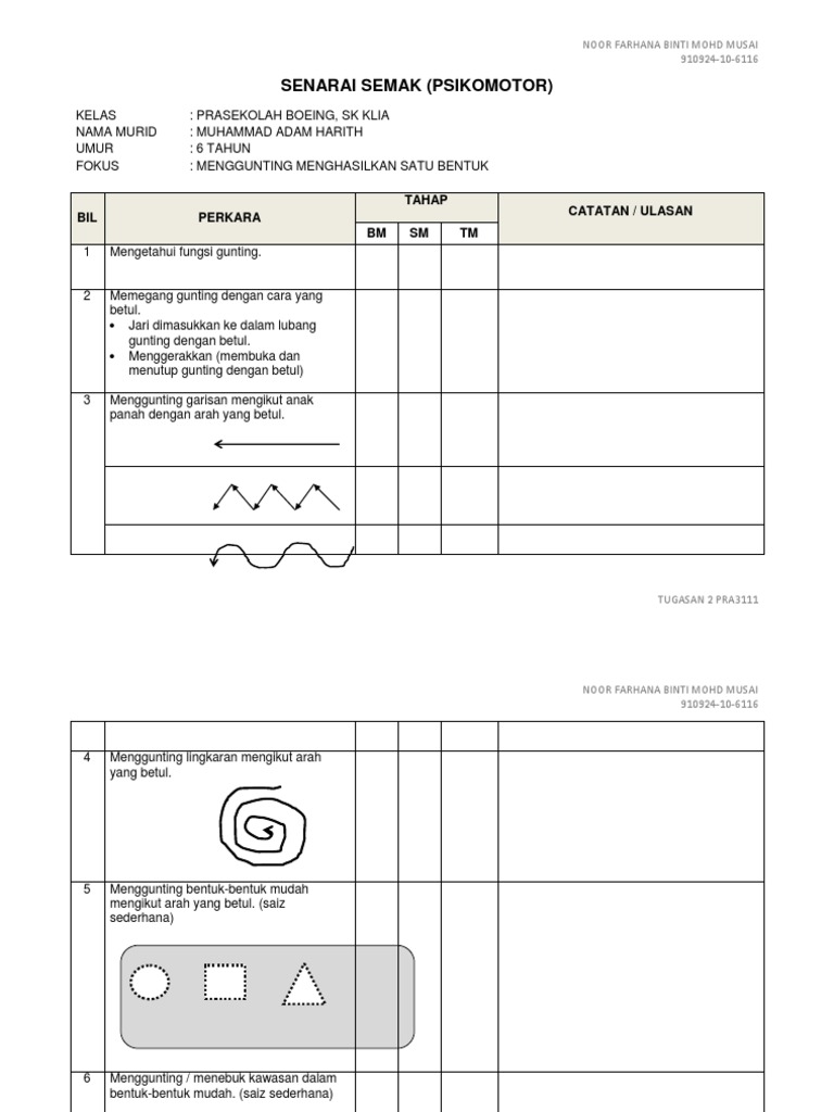 Contoh Senarai Semak Pemerhatian Prasekolah