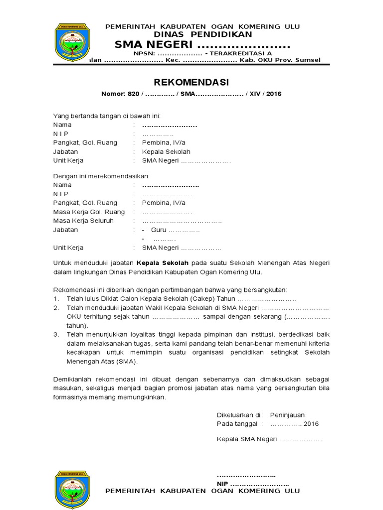 Rekomendasi Menduduki Jabatan Kepala Sekolah Contoh