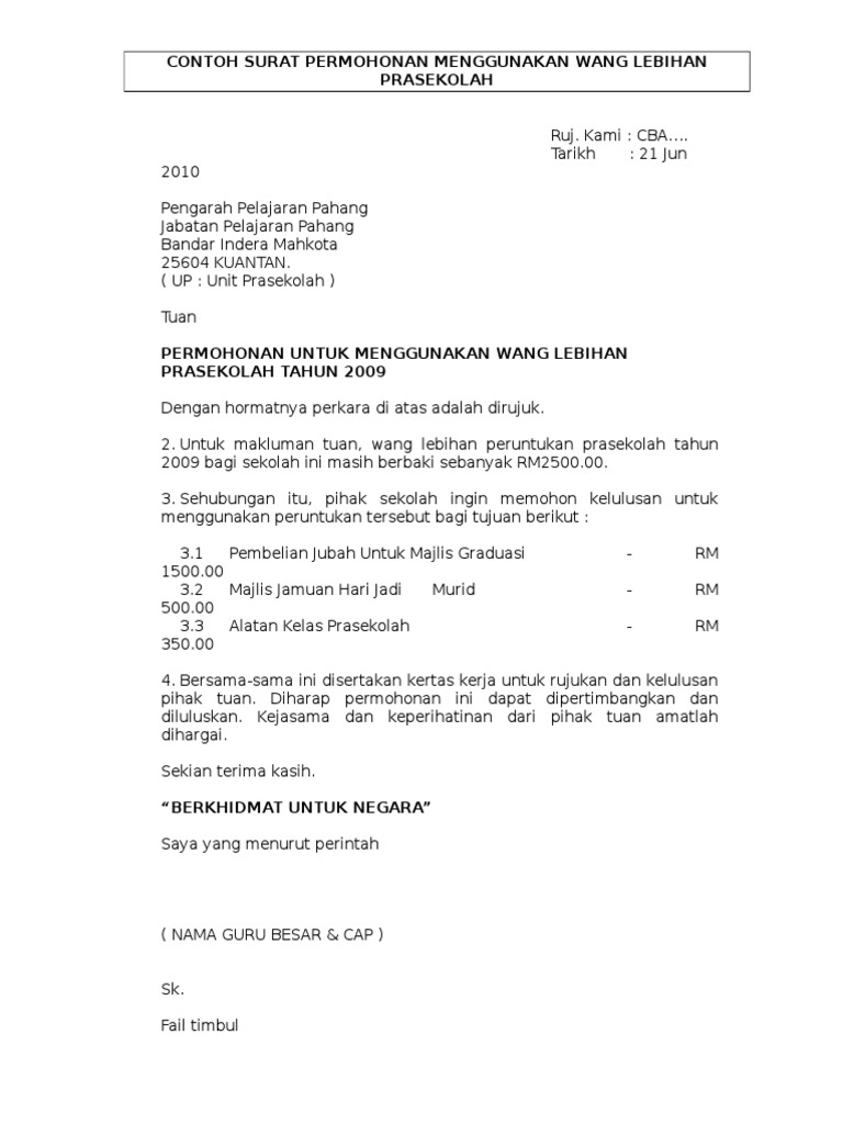 Contoh Surat Permohonan Menggunakan Wang Lebihan