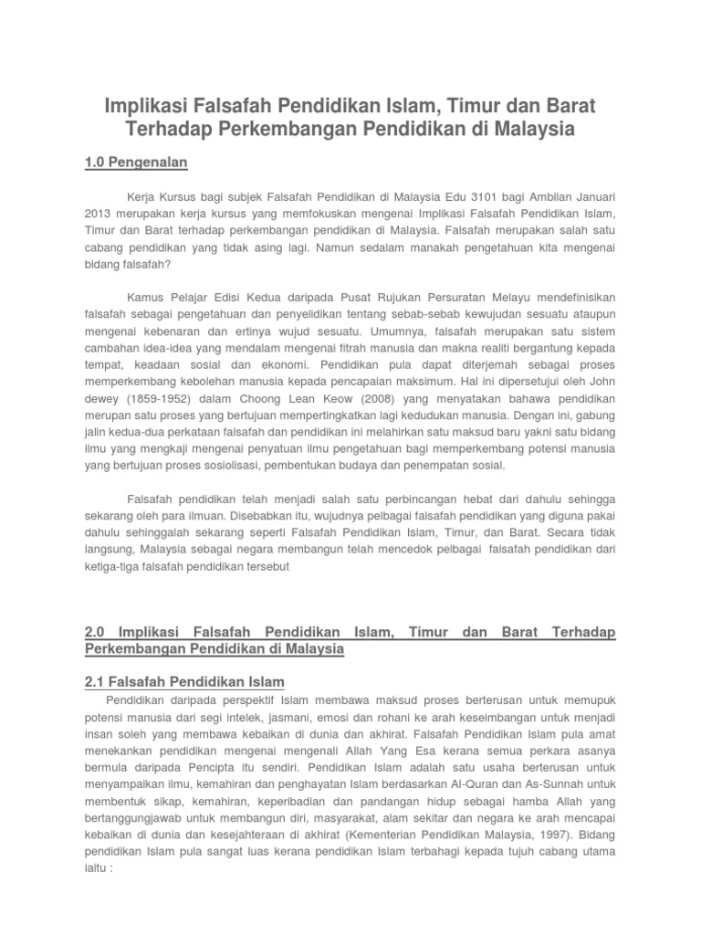 Implikasi Falsafah Pendidikan Timur Barat Islam Terhadap Falsafah Pendidikan Malaysia By Ateyn Hana
