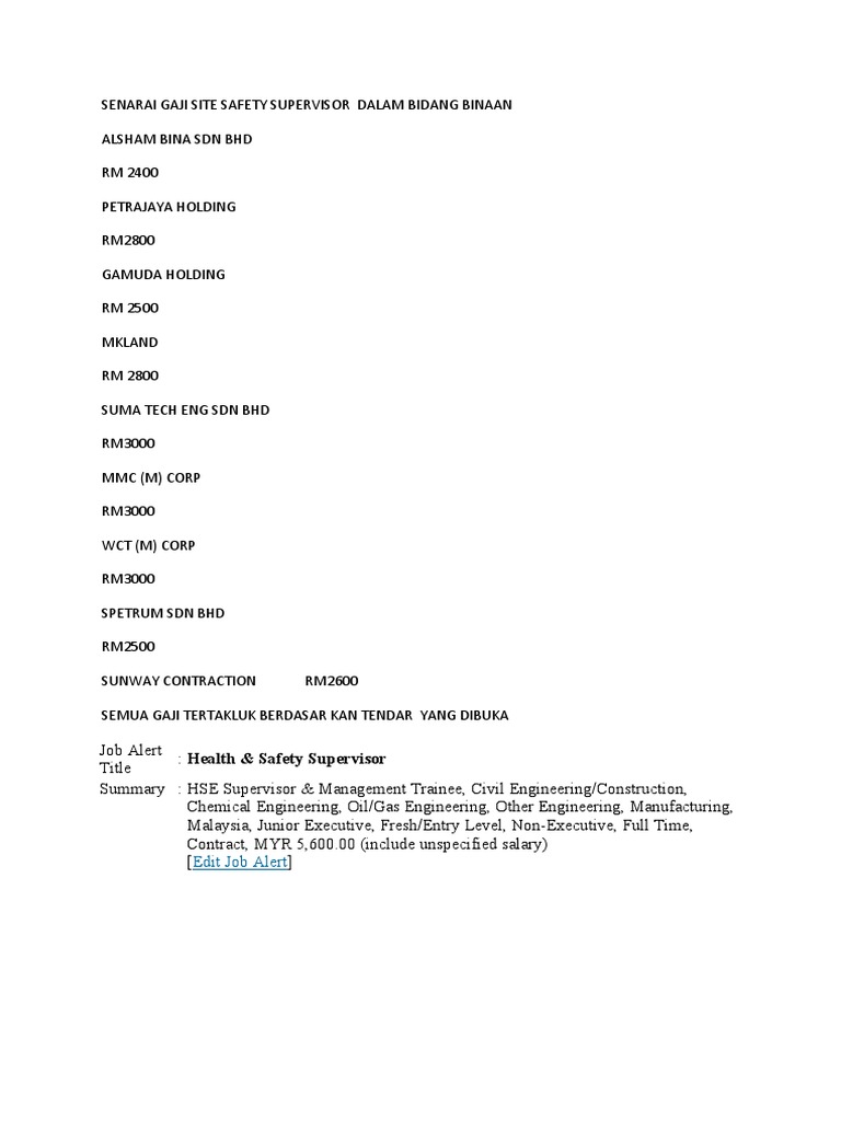 Senarai Gaji Site Safety Supervisor Dalam Bidang Binaan Malaysia
